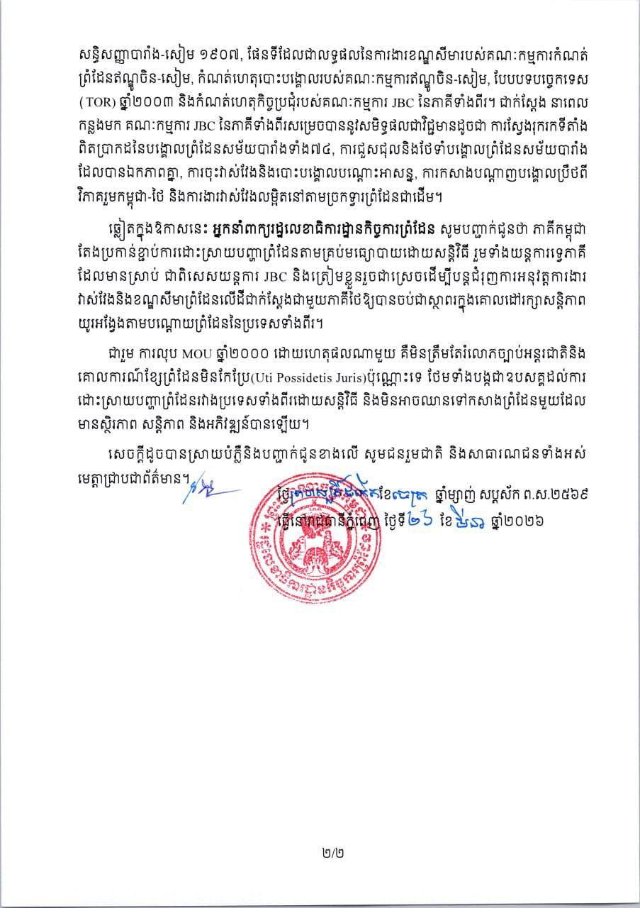 យោងតាមសេចក្តីប្រកាសបដិសេធព័ត៌មាន របស់អ្នកនាំពាក្យរដ្ឋលេខាធិការដ្ឋានកិច្ចការព្រំដែន នៅថ្ងៃទី២៦ ខែមីនា ឆ្នាំ២០២៦ បានឱ្យដឹងថា ការច្រានចោលលុប MOU ឆ្នាំ២០០០នេះដោយសារកាលពីថ្ងៃទី២៤ ខែមីនា ឆ្នាំ២០២៦ សារព័ត៌មានក្នុងស្រុកថៃ បានផ្សព្វផ្សាយព័ត៌មានដែលបានលើកអំពីហេតុផលនិងអនុសាសន៍ស្នើលុប MOU ៤៣ ឬMOU ឆ្នាំ២០០០ របស់គណៈកម្មាធិការចំពោះកិច្ចព្រឹទ្ធសភាថៃ ។