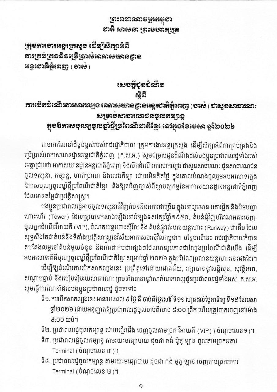 ភ្នំពេញៈ ក្រុមការងារអន្តរក្រសួងរបស់រាជរដ្ឋាភិបាលកម្ពុជា បានប្រកាសបើកដំណើរការសាកល្បង អាកាសយានដ្ឋានអន្តរជាតិភ្នំពេញ (ចាស់) ជាសួនសាធារណៈ សម្រាប់សាធារណជនចូលកម្សាន្តក្នុងឱកាសបុណ្យចូលឆ្នាំថ្មីប្រពៃណីជាតិខ្មែរ នៅក្នុងខែមេសា ឆ្នាំ២០២៦ខាងមុខ ។