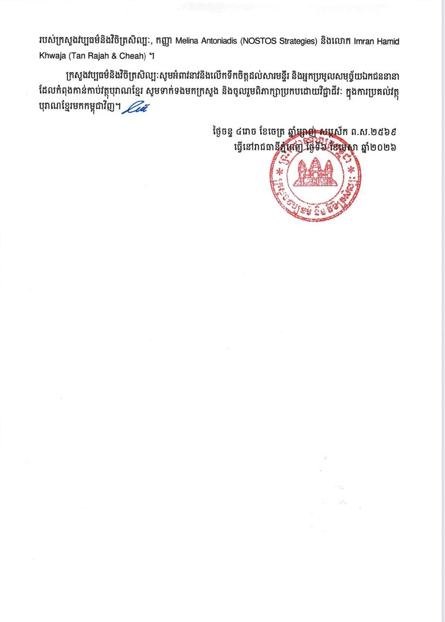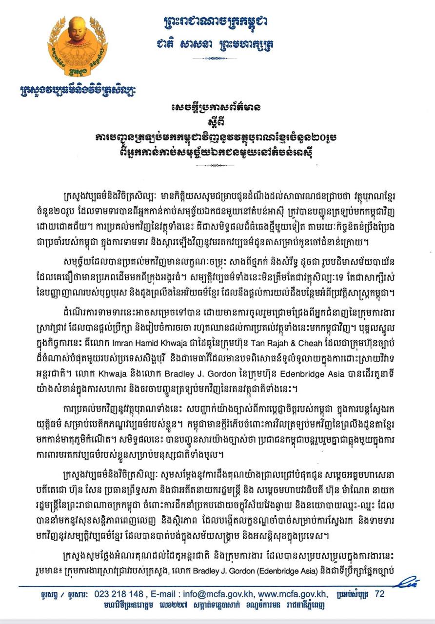 ភ្នំពេញៈ ក្រសួងវប្បធម៌ និងវិចិត្រសិល្បៈបានប្រកាសថា វត្ថុបុរាណខ្មែរចំនួន២០រូប ដែលទាមទារបានពីអ្នកកាន់កាប់សមុច្ច័យឯកជនមួយនៅតំបន់អាស៊ី ត្រូវបានបញ្ជូនត្រឡប់មកកម្ពុជាវិញ ដោយជោគជ័យ ។