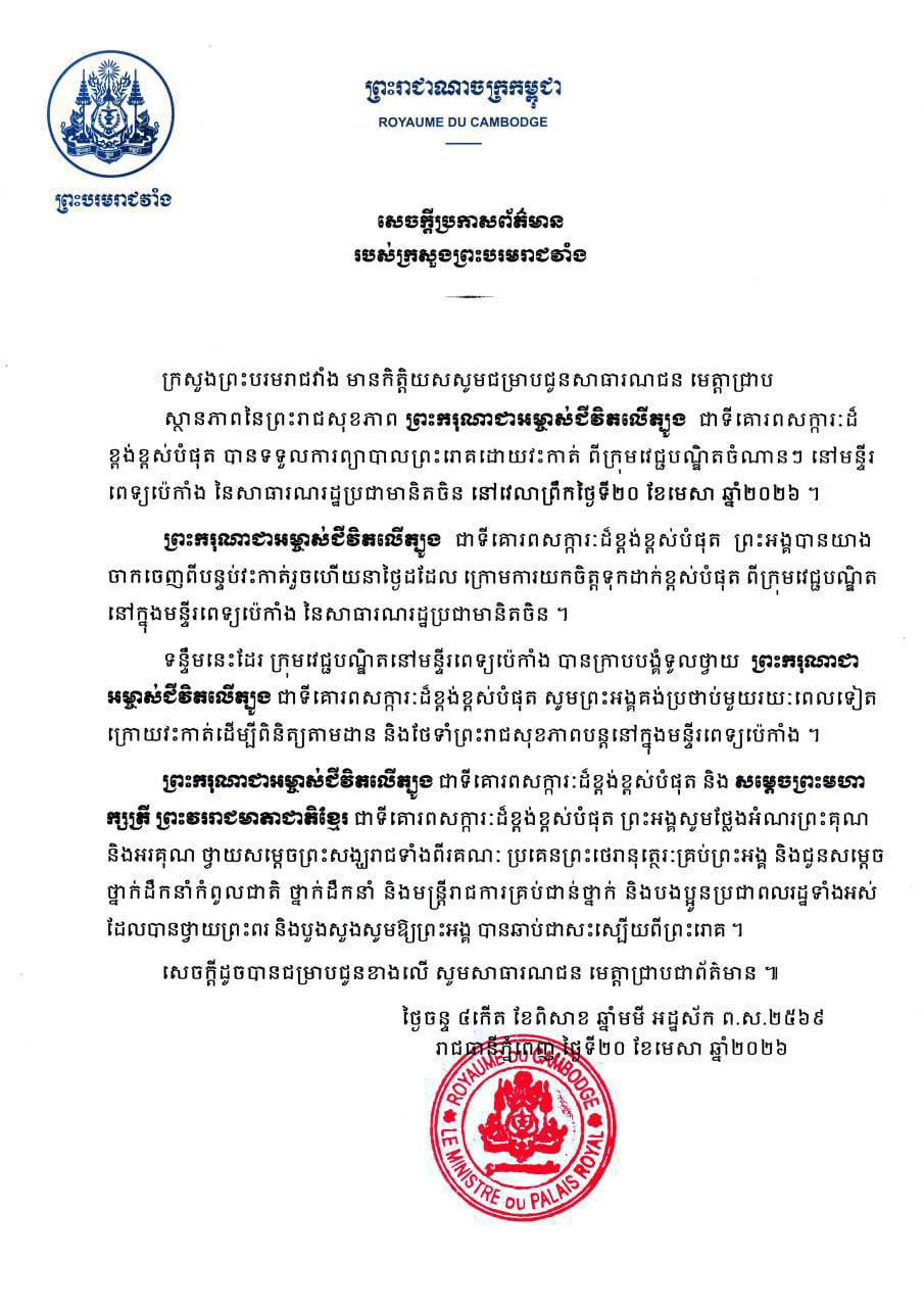 ភ្នំពេញៈ ក្រសួងព្រះបរមរាជវាំង ចេញសេចក្តីជូនដំណឹងស្តីពី ស្ថានភាពនៃព្រះរាជសុខភាព ព្រះករុណាជាអម្ចាស់ជីវិតលើត្បូង ជាទីគោរពសក្ការៈដ៏ខ្ពង់ខ្ពស់បំផុត បានទទួលការព្យាបាលព្រះរោគដោយវះកាត់ ពីក្រុមវេជ្ជបណ្ឌិតចំណានៗ នៅមន្ទីរ ពេទ្យប៉េកាំង នៃសាធារណរដ្ឋប្រជាមានិតចិន នៅវេលាព្រឹកថ្ងៃទី២០ ខែមេសា ឆ្នាំ២០២៦។