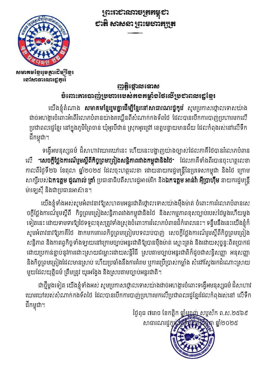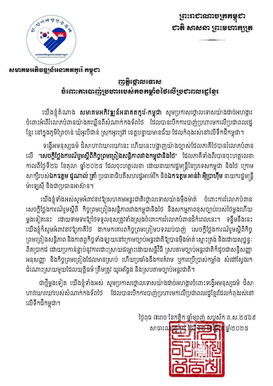 ភ្នំពេញៈ សមាគមខ្មែរចំនួន៦ ដែលមានមូលដ្ឋាននៅប្រទេសកូរ៉េខាងត្បូង នៅថ្ងៃទី១៣ ខែវិច្ឆិកា ឆ្នាំ ២០២៥នេះ បានចេញញត្តិដាច់ដោយឡែកពីគ្នា ដោយថ្កោលទោសយ៉ាងដាច់អហង្ការចំពោះអំពើរំលោភបំពានយ៉ាងគឃ្លើនពីសំណាក់កងទ័ពថៃ ដែលបានបើកការបាញ់ប្រហារមកលើប្រជាពលរដ្ឋខ្មែរ នៅភូមិព្រៃចាន់ ឃុំអូរបីជាន់ ស្រុកអូរជ្រៅ ខេត្តបន្ទាយមានជ័យ ដែលកំពុងរស់នៅលើទឹកដីកម្ពុជា។