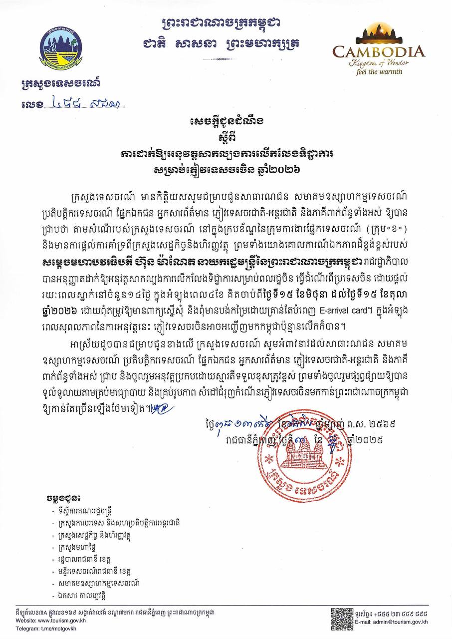 ភ្នំពេញៈ ប្រមុខរាជរដ្ឋាភិបាលកម្ពុជា បានសម្រេចផ្ដល់ការលើកលែងទិដ្ឋាការសាកល្បងសម្រាប់ពលរដ្ឋចិន ធ្វើដំណើរពីប្រទេសចិន រយៈពេល ៤ខែ គិតចាប់ពីថ្ងៃទី១៥ ខែមិថុនា ដល់ថ្ងៃ ទី១៥ ខែតុលា ឆ្នាំ២០២៦។
