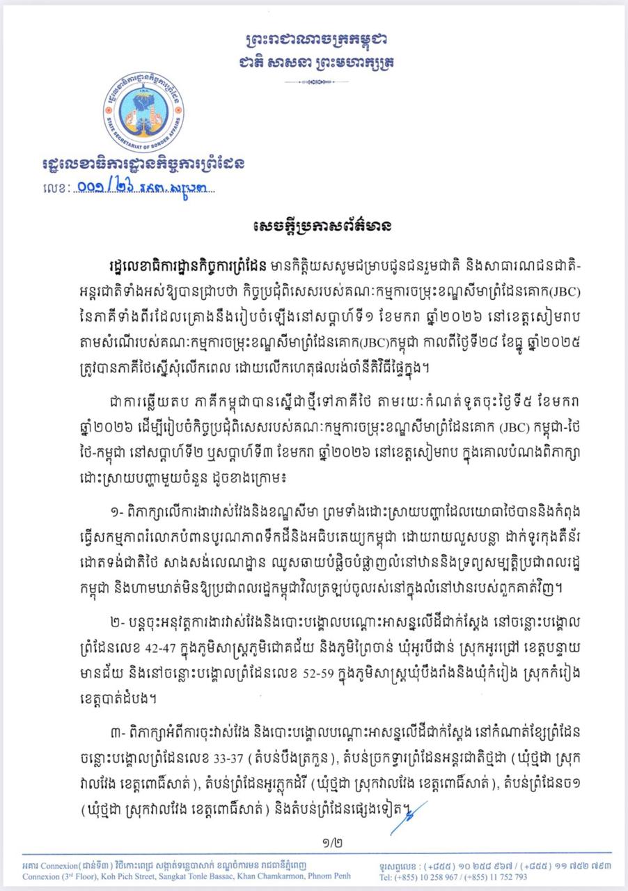 ភ្នំពេញៈ កម្ពុជាបានស្នើឱ្យភាគីថៃ ប្រជុំពិសេសរបស់គណៈកម្មការចម្រុះខណ្ឌសីមាព្រំដែនគោក JBC នៅសប្តាហ៍ទី២ឬ៣ ខែមករា ឆ្នាំ២០២៦ ដើម្បីដោះស្រាយបញ្ហាដែលយោធាថៃ រំលោភបំពានបូរណភាពទឹកដីនិងអធិបតេយ្យកម្ពុជា ដោយរាយលួសបន្លា ដាក់ទូរកុងតឺន័រ ដោតទង់ជាតិថៃ សាងសង់លេណដ្ឋាន ឈូសឆាយបំផ្លិចបំផ្លាញលំនៅឋាននិងទ្រព្យសម្បត្តិប្រជាពលរដ្ឋកម្ពុជា។