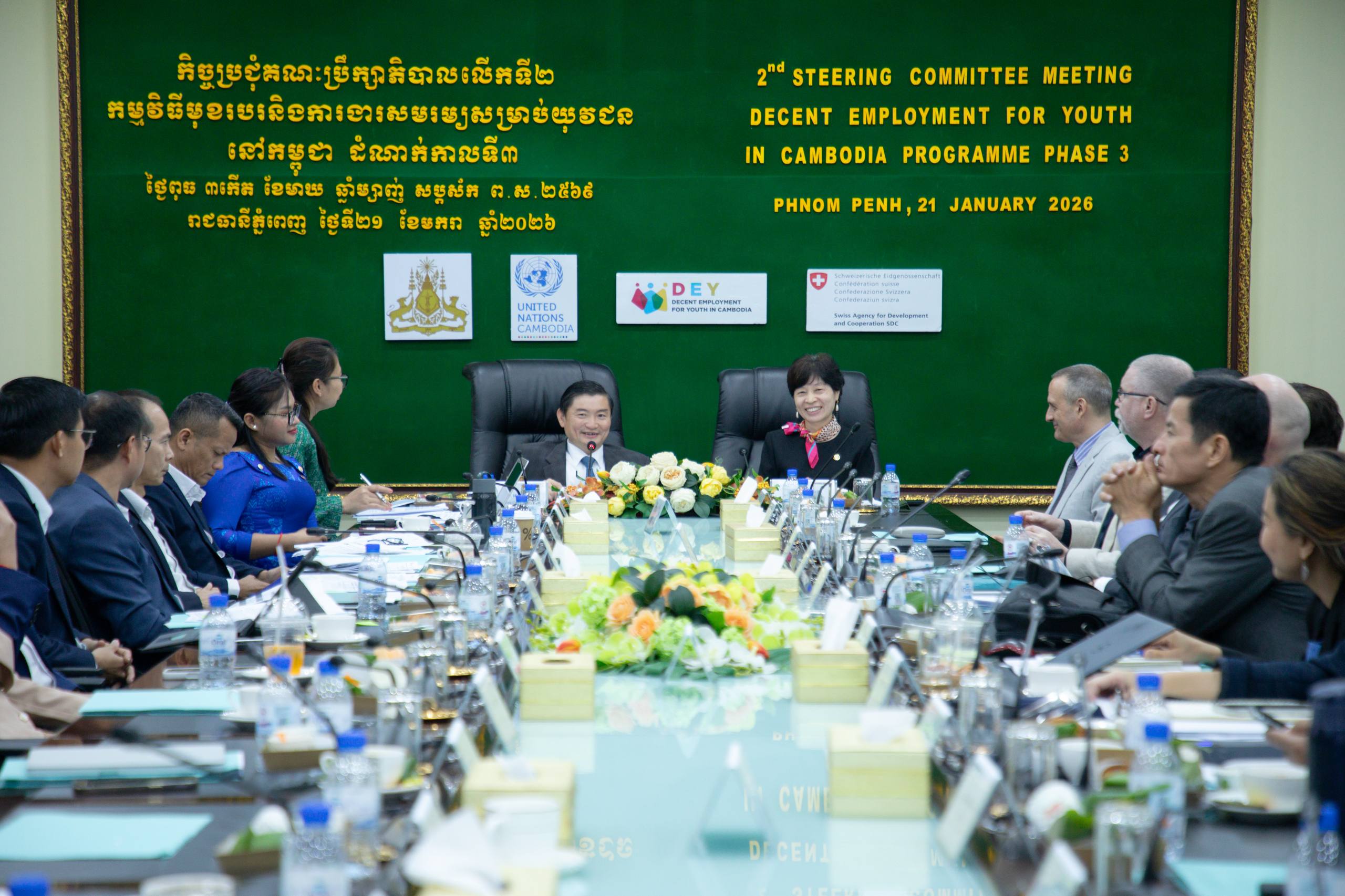 លោក ហេង សួរ រដ្ឋមន្រ្តីក្រសួងការងារ និងបណ្តុះបណ្តាលវិជ្ជាជីវៈ និងលោកស្រី Xiaoyan Qian នាយិកាការិយាល័យអង្គការអន្តរជាតិខាងការងារ (ILO) ប្រចាំប្រទេសកម្ពុជា ឡាវ និងថៃ និងជាតំណាងអង្គការសហប្រជាជាតិ (UN) ប្រចាំកម្ពុជា បានអញ្ជើញធ្វើជាសហប្រធានក្នុងកិច្ចប្រជុំលើកទី២ របស់គណៈប្រឹក្សាភិបាល នៃកម្មវិធីមុខរបរ និងការងារសមរម្យសម្រាប់យុវជននៅកម្ពុជា ដំណាក់កាលទី៣ (DEY III) នារសៀលថ្ងៃពុធ ទី២១ ខែមករា ឆ្នាំ២០២៦ នៅទីស្តីការក្រសួង។ កិច្ចប្រជុំលើកទី២នេះ មានគោលបំណងសំខាន់ៗ ដើម្បីពិនិត្យ និងវាយតម្លៃវឌ្ឍនភាពដែលសម្រេចបានក្រោមកម្មវិធី DEY III ក្នុងឆ្នាំ២០២៥ រួមទាំងបញ្ហាប្រឈមចម្បងៗ ផែនការការងារឆ្នាំ២០២៦ និងថវិការបស់កម្មវិធី DEY III សម្រាប់ឆ្នាំ២០២៦ ព្រមទាំងផ្តល់អនុសាសន៍នានា ស្របតាមអាទិភាពរបស់រាជរដ្ឋាភិបាលកម្ពុជា ស្តីពីការអភិវឌ្ឍជំនាញ និងការងារសមរម្យសម្រាប់យុវជន។
