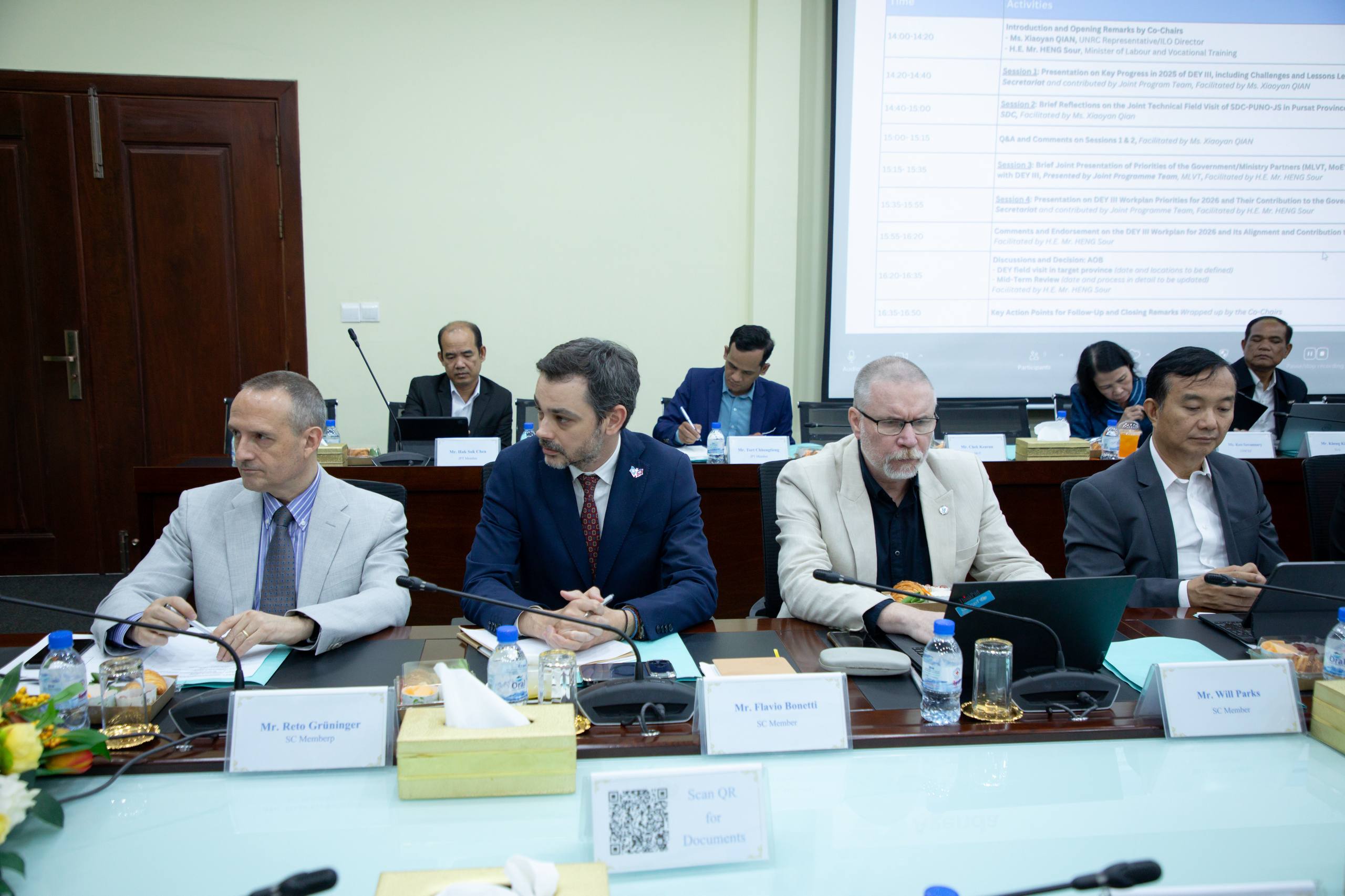 ការអនុវត្តកម្មវិធី DEY III ក្នុងឆ្នាំ២០២៦ កម្មវិធីក៏នឹងពិចារណា ក្នុងការផ្តល់ការគាំទ្រដល់ពលករចំណាកស្រុកដែលត្រឡប់ពីបរទេសវិញឱ្យទទួលបានការងារ ដើម្បីគាំទ្រការខិតខំប្រឹងប្រែងយ៉ាងធំធេងរបស់រាជរដ្ឋាភិបាលកម្ពុជា។ លោករដ្ឋមន្ត្រីបានសម្តែងការកោតសរសើរចំពោះអ្នកសម្របសម្រួលអង្គការសហប្រជាជាតិ ដៃគូអង្គការសហប្រជាជាតិ (ILO, UNESCO, UNICEF, UNIDO) និងក្រសួង ស្ថាប័នពាក់ព័ន្ធ ចំពោះកិច្ចសហការយ៉ាងជិតស្និទ្ធ ក្នុងការសម្រេចបាននូវសមិទ្ធផលការងារតាមការគ្រោងទុក ក៏ដូចជាទីភ្នាក់ងារស្វីសសម្រាប់ការអភិវឌ្ឍនិងកិច្ចសហប្រតិបត្តិការ (SDC) ដែលបានបន្តគាំទ្រហិរញ្ញប្បទានដល់កម្មវិធីនេះ។