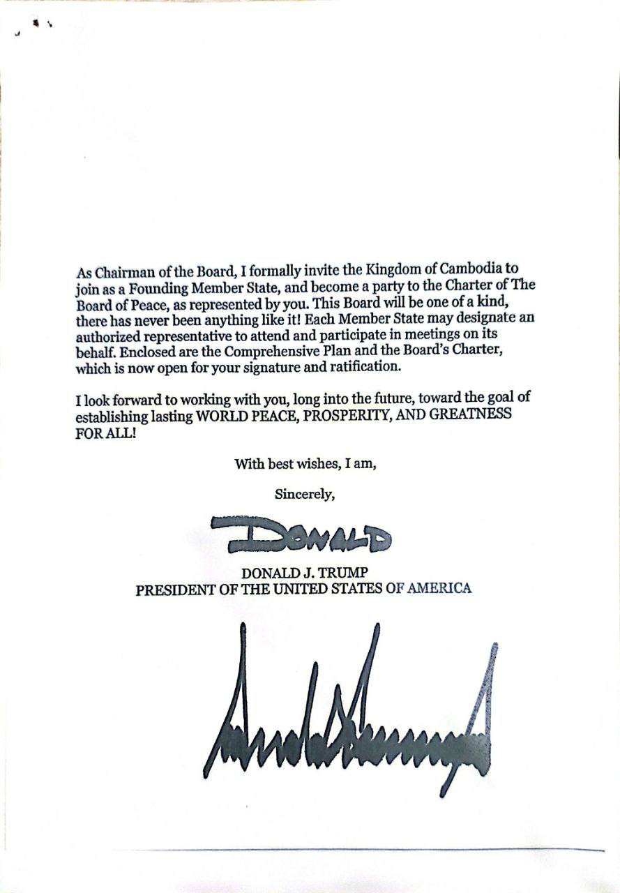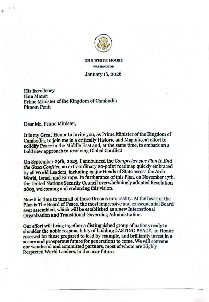 យោងតាមបណ្ដាញសង្គមផ្លូវការរបស់សម្ដេចធិបតី ហ៊ុន ម៉ាណែន នាយករដ្ឋមន្រ្ដីកម្ពុជានាព្រឹកថ្ងៃទី២៧ ខែមករា ឆ្នាំ២ផ២៦នេះថា កម្ពុជាសម្រេចចូលរួមជាសមាជិកស្ថាបនិកនៃក្រុមប្រឹក្សាសន្តិភាព (The Board of Peace) តាមការអញ្ជើញរបស់ឯកឧត្តមប្រធានាធិបតីសហរដ្ឋអាមេរិក Donald J. Trump កាលពីថ្ងៃ ទី១៦ ខែមករា ឆ្នាំ២០២៦។
