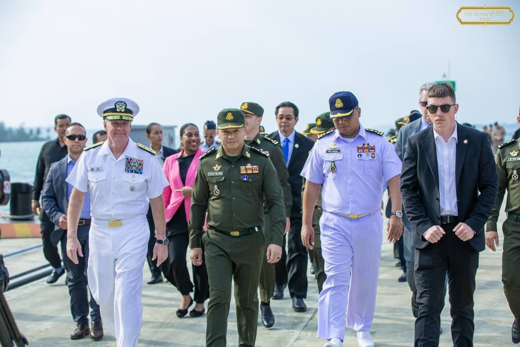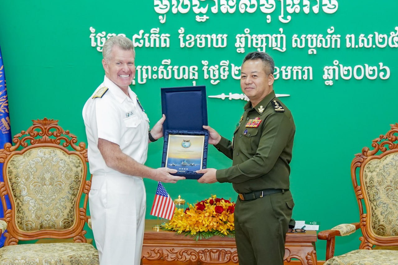 ទទួលស្វាគមន៍ លោកនាយឧត្តមនាវី Samuel Paparo មេបញ្ជាការនៃបញ្ជាការដ្ឋានឥណ្ឌូ-ប៉ាស៊ីហ្វិក នៃសហរដ្ឋអាមេរិក ក្នុងជំនួបសម្តែងការគួរសម និងពិភាក្សាការងារ និងឡើងទស្សនកិច្ចលើនាវាចម្បាំងអាមេរិក USS CINCINNATI (LCS 20) ដែលបានចូលសំចតនៅមូលដ្ឋានសមុទ្ររាម ខេត្តព្រះសីហនុ ពីថ្ងៃទី២៤ ដល់ថ្ងៃទី២៨ ខែមករា ឆ្នាំ២០២៦ ដើម្បីលើកកម្ពស់ទំនាក់ទំនង និងកិច្ចសហប្រតិបត្តិការរវាងកងទ័ពជើងទឹកកម្ពុជា-អាមេរិក ដែលប្រព្រឹត្តទៅនៅ មូលដ្ឋានសមុទ្ររាម។