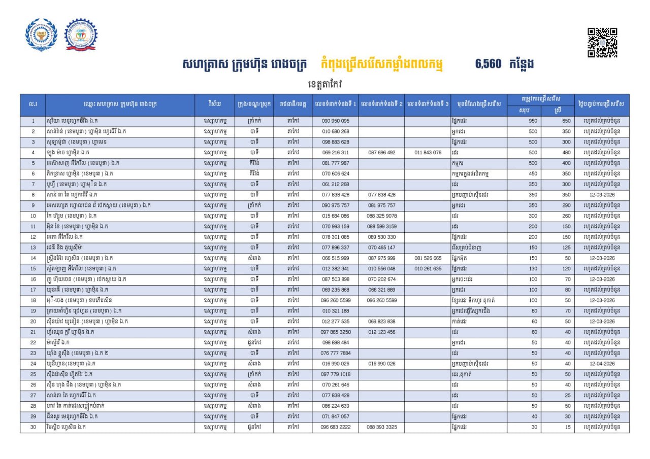តាមរយៈការផ្សព្វផ្សាយរបស់ក្រសួងការងារបានឱ្យដឹងថា គិតត្រឹមថ្ងៃទី០៦ ខែមីនានេះ ខេត្តតាកែវ មានឱកាសការងារចំនួន ៦,៥៦០កន្លែង កំពុងរង់ចាំបងប្អូនអតីតពលករត្រឡប់មកពីប្រទេសថៃ និងអ្នកកំពុងស្វែងរកការងារធ្វើក្នុងវិស័យឧស្សាហកម្ម។