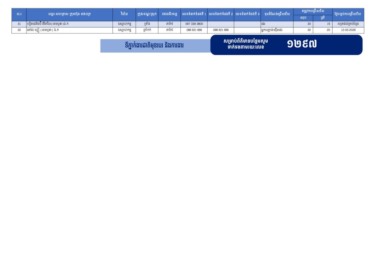 បើតាមក្រសួងការងារ ក្រៅពីទំនាក់ទំនងផ្ទាល់ជាមួយក្រុមហ៊ុន រោងចក្រ សហគ្រាស អ្នកស្វែងរកការងារទាំងអស់ ជាពិសេសបងប្អូនអតីតពលករ ក៏អាចទាក់ទងមកប្រព័ន្ធទំនាក់ទំនងបន្ទាន់ ១២៩៧ ដើម្បីឱ្យក្រុមការងារក្រសួងជួយសម្របសម្រួលស្វែងរកការងារជូនផងដែរ៕