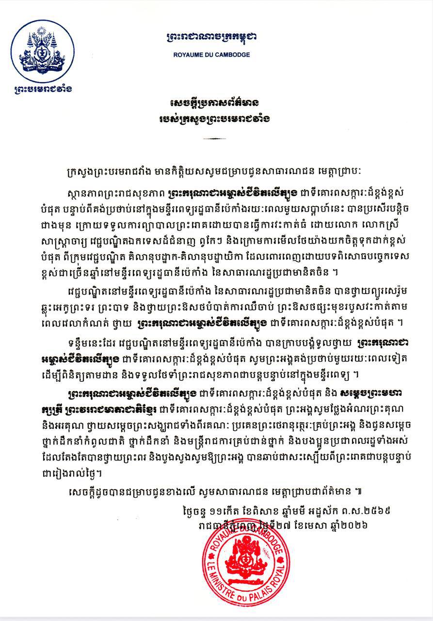 ភ្នំពេញៈ ក្រសួងព្រះបរមរាជវាំង បង្ហាញស្ថានភាពព្រះរាជសុខភាព ព្រះបាទសម្តេចព្រះបរមនាថ នរោត្តម សីហមុនី ព្រះមហាក្សត្រ នៃព្រះរាជាណាចក្រកម្ពុជា បន្ទាប់ពីគង់ប្រថាប់នៅក្នុងមន្ទីរពេទ្យរដ្ឋធានីប៉េកាំងរយៈពេលមួយសប្តាហ៍នេះ បានប្រសើរជាងមុន។